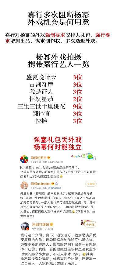 為什么粉絲的訴求這么強烈,就是因為上圖所述內容。疑似現在嘉行以外的資源如果要找楊冪合作,都被要求安排大禮包,也就是要帶上幾個嘉行的其他藝人。同時嘉行還會要求成為出品方和要求制作權,遇到這樣的要求,顯然一般的公司都不可能答應,那相當于把整個項目賣給嘉行了一樣,已經不像合作了。所以因此,基本楊冪的外部資源因此被斷。