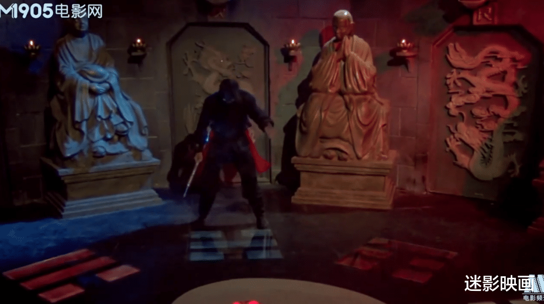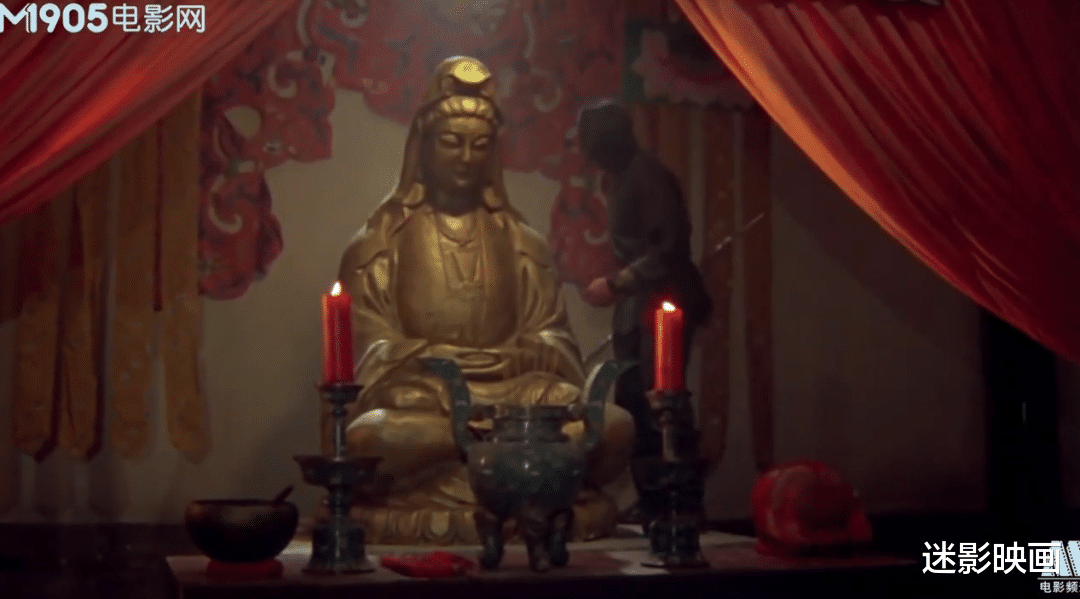 蒙面人在樓內展開搜索,發現了隱藏在觀音像旁的密室入口,隨即翻身進入密道,
