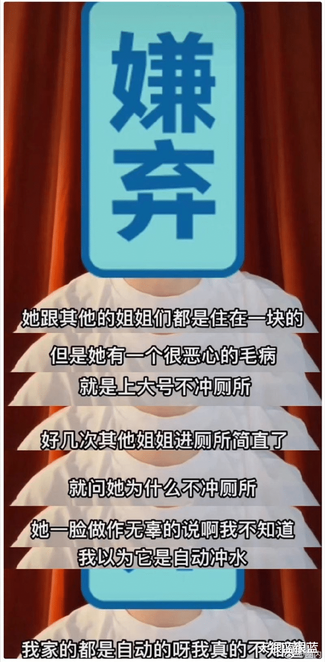 爆料者還說女星衛生習慣很差,當時幾個姐姐們同住一間公寓,結果對方上完大號不愛沖水,被其他姐姐撞見好幾次,并詢問女星到底為什么不處理,結果女星一臉無辜的回答自己不知道,說家里都是自動沖水的,以為宿舍也會是這樣,讓其他人超無言。有一次幾位姐姐排練時,有一位女星發現對方沒穿內衣,其他女星便立刻上前提醒,結果女星這時才抱住自己的胸部大叫,說自己忘記了。