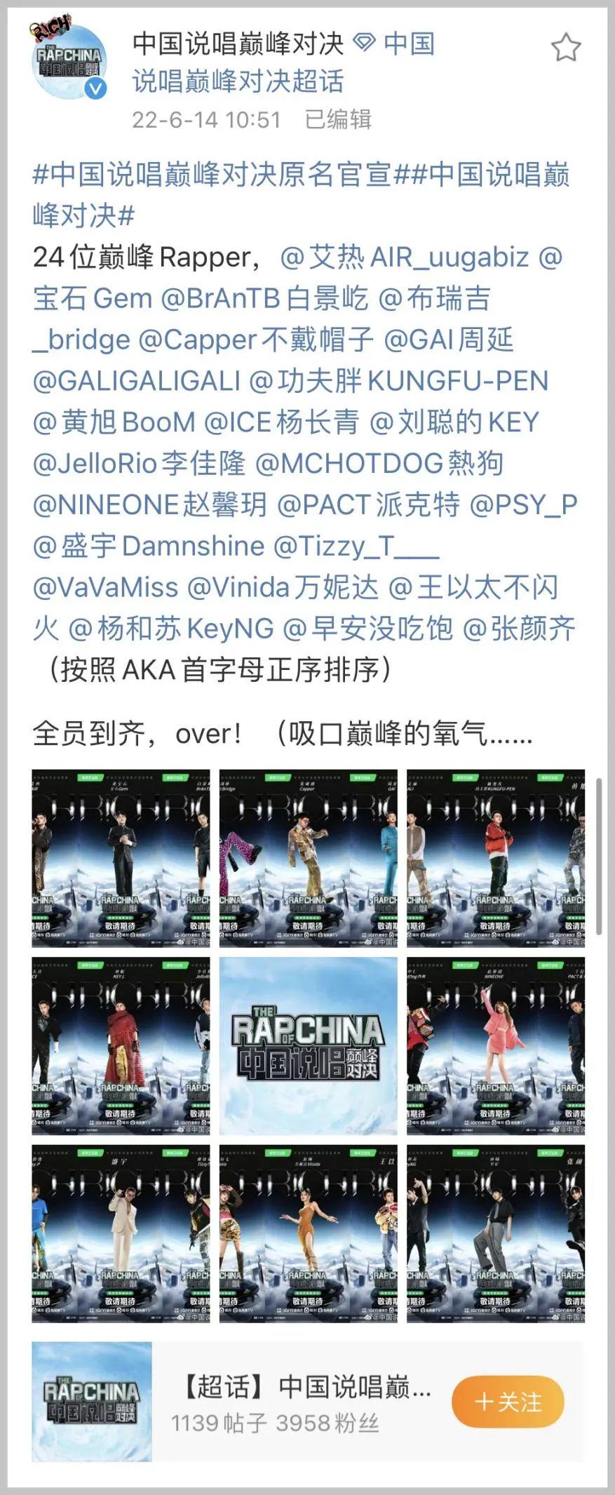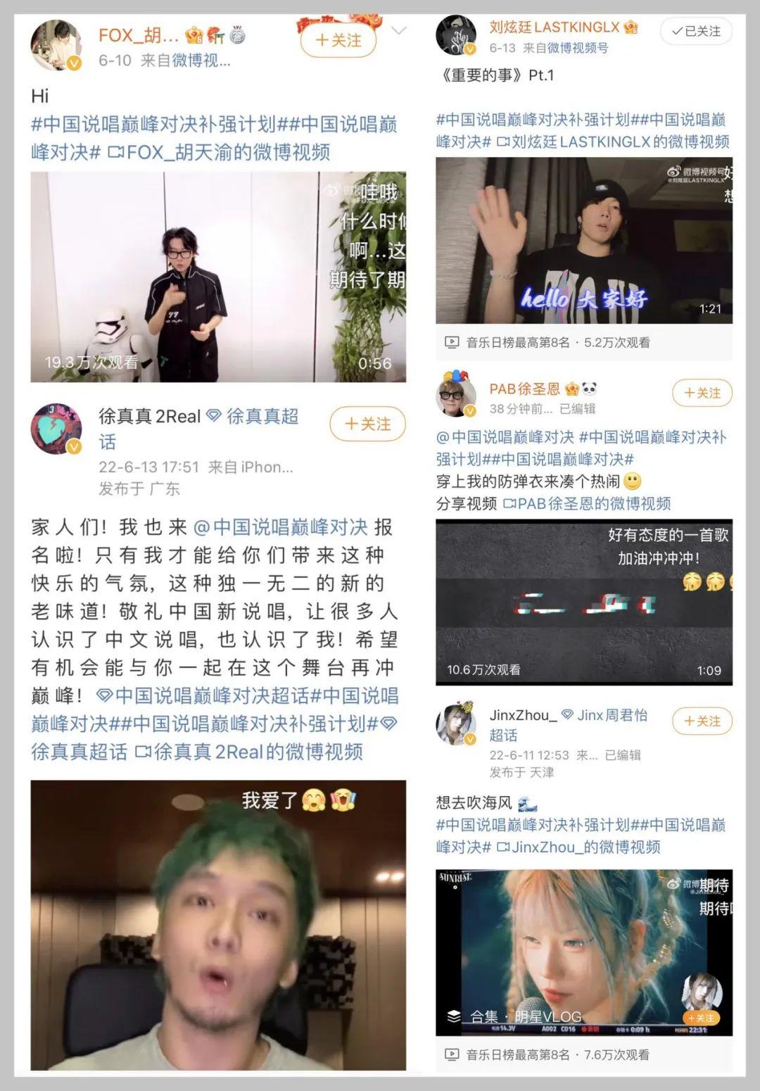 其實除了參賽選手陣容,大貓覺得微博上的參與#中國說唱巔峰對決補強計劃#的rapper陣容也是很有看點的。