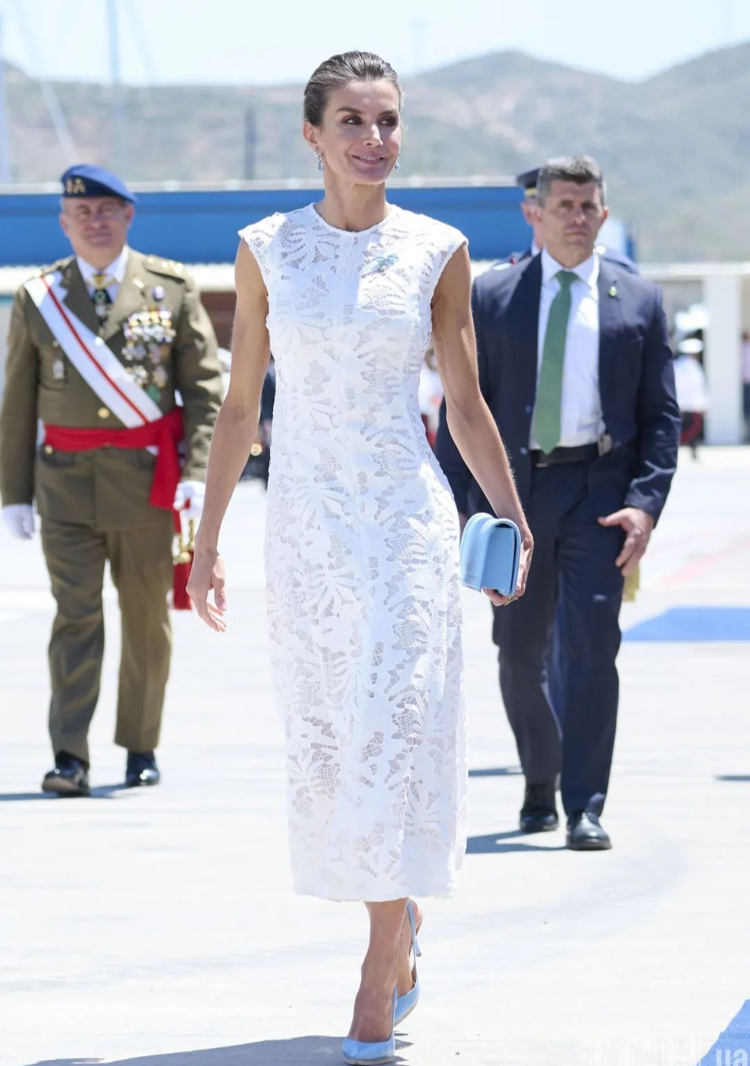萊后穿白色蕾絲裙,搭配天藍色手包、高跟鞋、耳環(huán)和胸針,配色很清爽。不過,白色蕾絲真得挺難駕馭。