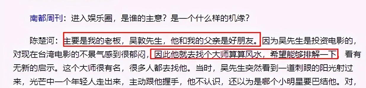 其實,陳楚河是最反對進入娛樂圈的,據傳有一神秘大佬反復勸他,最終他才同意,而這個人正是臺灣娛樂圈大佬吳敦。