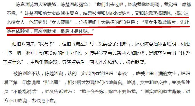陳楚河和這些女人交往的過程中,還總結了泡妞秘訣,“帶女生看恐怖片,先讓她有依賴感,再來幽默感,最后才是體貼。”