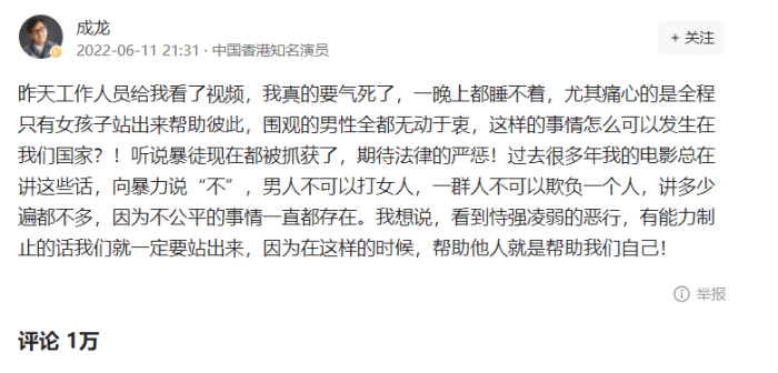香港知名影星成龍也發(fā)文稱:看過視頻后被氣得一晚上睡不著,尤其是全程幫助女生的只有她的朋友,圍觀者竟然無動(dòng)于衷,這不應(yīng)該發(fā)生在我們的國家