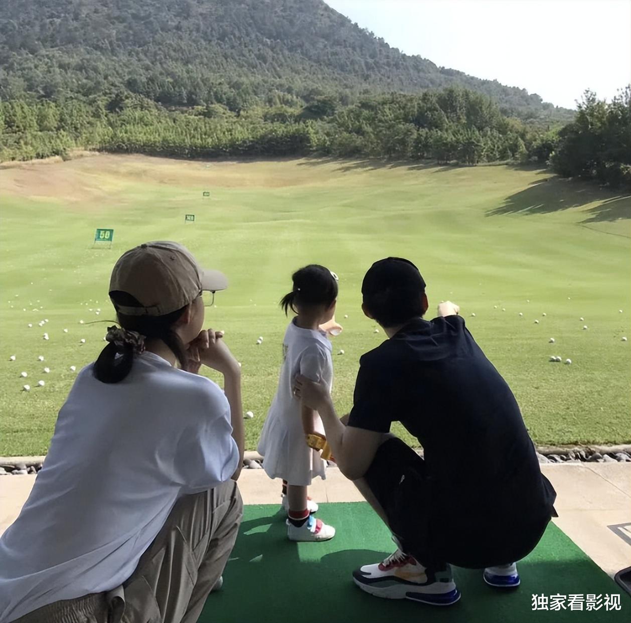 夫妻倆帶著年幼的女兒去打高爾夫球,一家三口的背影看著就很溫馨。