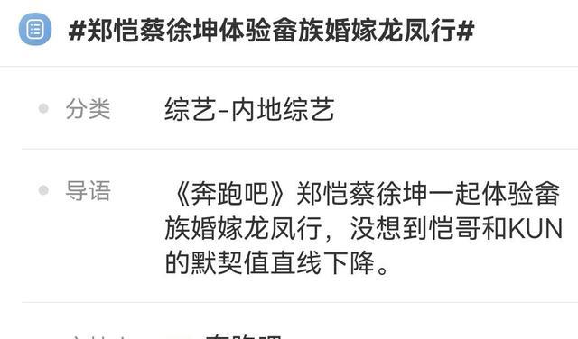 《奔跑吧》第五期,嘉賓們一起體驗畬族的風土人情,開播前官方建話題造勢,詞條為“鄭愷蔡徐坤體驗畬族婚嫁與鳳行”,該項活動是畬族的傳統(tǒng)婚嫁,新郎新娘腳不能著地,配合默契才能通過,而鄭愷蔡徐坤踴躍嘗試后,默契為0,直呼“結(jié)不了婚”。
