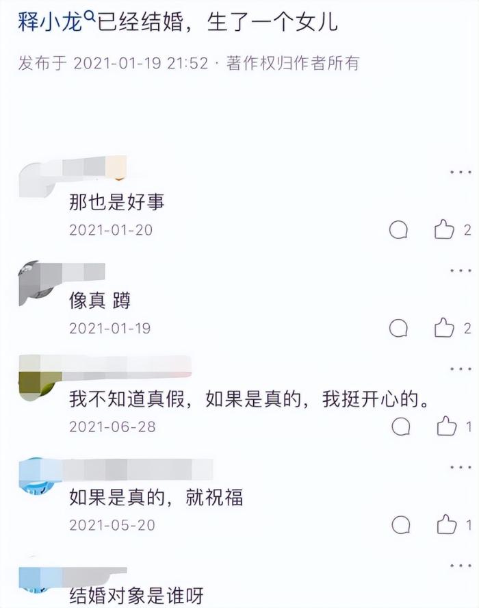 實際上,早在2021年,就有人爆料釋小龍結婚生子的消息,但當時并沒有引起網友們的注意,即便是得知消息的網友也覺得很開心,看得出,大家都希望釋小龍能早點成立自己的小家庭!