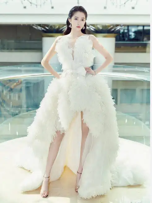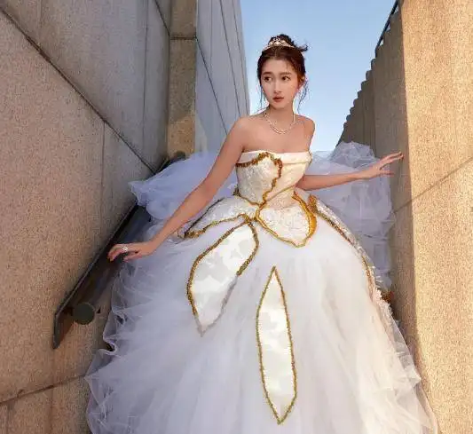 而且裙子的下擺采用了層層疊疊的紗。蛋糕裙充滿著公主的風(fēng)格,但是同時一半裙子的設(shè)計能夠顯示出一些調(diào)皮感。打破了我們傳統(tǒng)認(rèn)知中的婚紗配高跟鞋,關(guān)曉彤穿的是小白鞋。除了不想再有身高上的壓力之外,這樣的鞋還有一個好處就是顯得更加甜美俏皮。頭上就是很普通的設(shè)計了。身上要素過度了,頭紗在紛繁復(fù)雜就有累贅感。