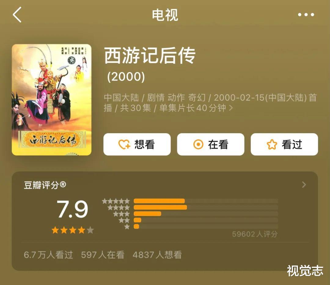 再加上2005年豆瓣的出現,提供了一個出口,于是,3.9分的認證,就這么把《西游記后傳》釘在了「爛片」的恥辱柱上。直到近幾年,嘗過各種口味「對經典的翻拍和改編」之后,大家越來越意識到,《西游記后傳》雖然依舊是神神魔魔那些事,但是,卻是對「西游」解構中最顛覆,邏輯最順滑自洽,價值觀最普世的「神劇」。偶然翻了翻豆瓣,評分也悄無聲息地漲到了7.9分,很顯然,這么多年大家都成熟了。