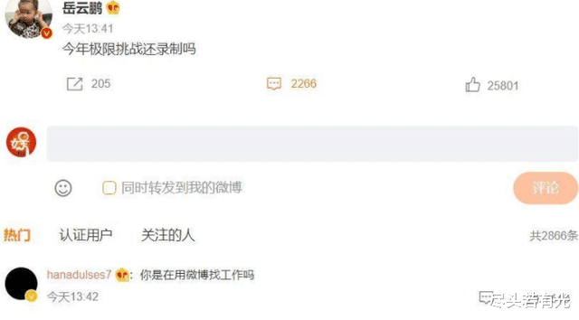 對于《極限挑戰》這檔綜藝節目,大家的印象也是最深刻的,雖然極限男人幫經歷了換人,或許沒有了最開始那種熟悉的味道了,但后面加入《極限挑戰》的各位嘉賓們也都給大家帶來了很多精彩的節目,比如岳云鵬,在第五季加入《極限挑戰》之后,已經連續錄制三季了,并且參加了一季公益行,而岳云鵬在節目當中的表現也是非常精彩的,獲得了很多觀眾的喜愛。當然云,岳云鵬對于《極限挑戰》這檔節目也是非常喜愛的,甚至在5月29日的下午還專門發微博詢問大家:今年的極限挑戰還錄制嗎?而網友的回應也都是非常搞笑,比如你是在微博上找工作嗎?這個問題你問我,好家伙又沒通知你嗎?等等,不得不說,網友們的腦回路也是千奇百怪。