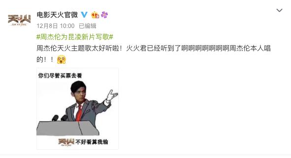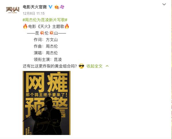 12月9日,在《天火》的超前看片會(huì)上,官方宣布:周杰倫的新歌不管是音頻還是MV,都只能到電影院看《天火》才能聽(tīng)到和看到。