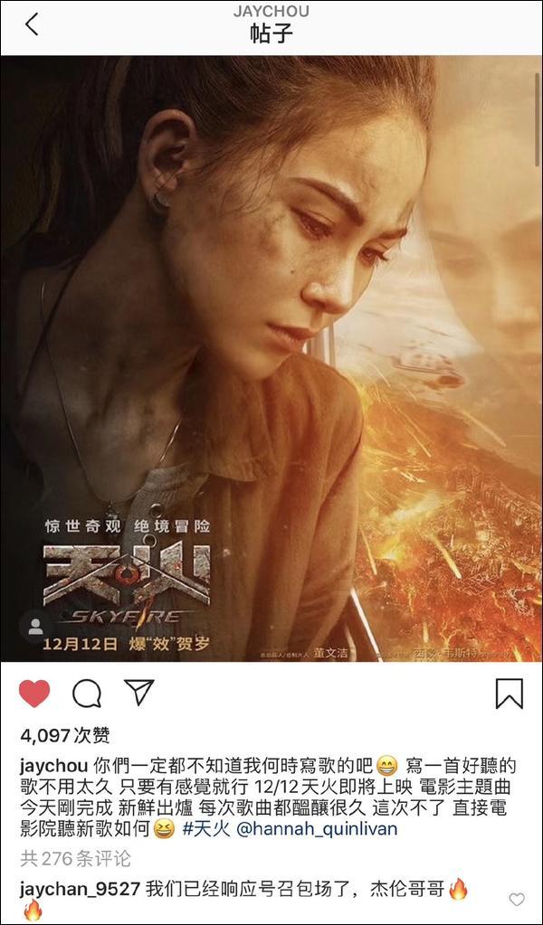 電影《天火》上映,導(dǎo)演是國(guó)際著名大導(dǎo)演西蒙韋斯特,主演是昆凌、王學(xué)圻、竇驍?shù)取F鋵?shí)這部電影的實(shí)打?qū)嵉目袋c(diǎn)還是蠻多的,但是神奇的地方是官方的宣傳似乎一直都圍繞著昆凌的老公周杰倫。周杰倫為這部片寫(xiě)的主題曲成為主角,周董寵妻帶貨成為話題,上映第一天拿了單日票房冠軍,可惜口碑卻砸了。
