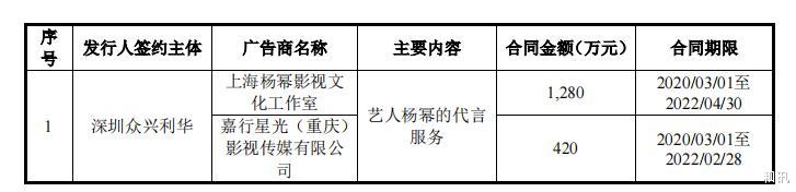 從歡樂家的招股書中了解到,公司通過兩家廣告商聘請楊冪為椰子汁產品代言人,合同金額合計1700萬元。楊冪也于2020年4月25日,通過個人微博,官宣了與歡樂家之間的合作。