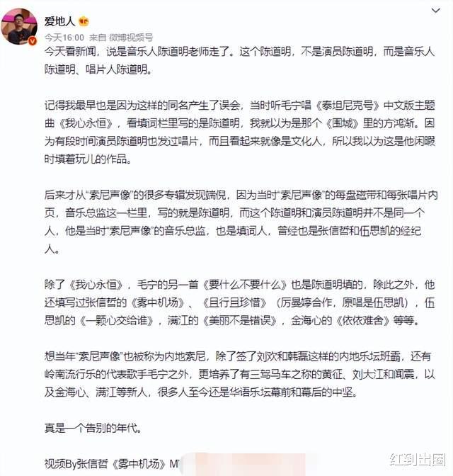如這位樂評人所言,這是一個告別的年代,很多知名藝人都相繼離開?;蛟S再過不久,就更沒有人記得他們的名字了。但他們的作品,依舊在歲月中灼灼生輝。最后,愿陳道明老師一路走好。
