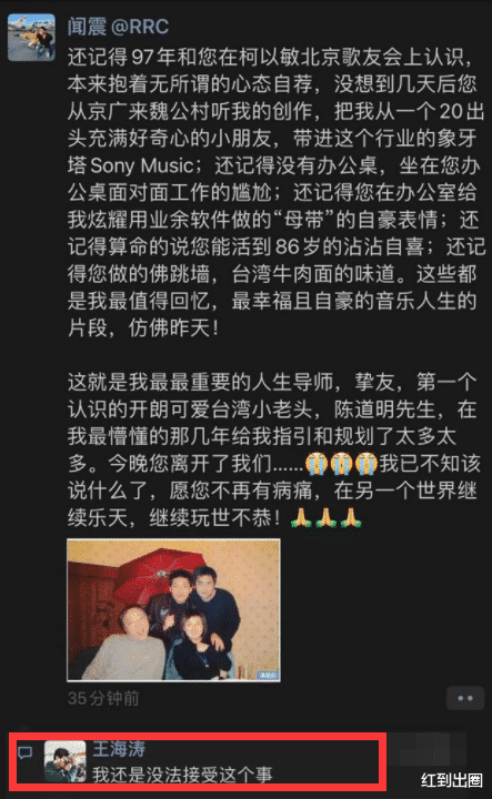 得知陳道明去世的消息,音樂制作人發(fā)長文悼念,他不僅是好友,也是人生導師,難得一遇的伯樂。王海濤悲痛難忍,直言:“我還是沒法接受這個事”。