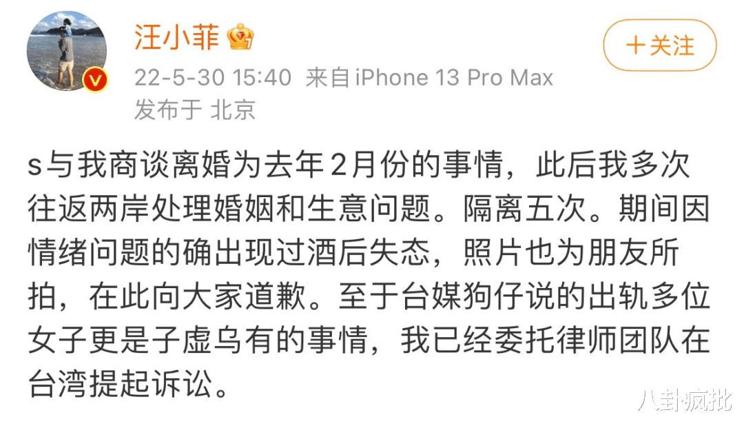 而汪小菲也是被逼急了,事情越演越烈的情形下,他發微博說自己和大S早在去年2月就已經走協議離婚的程序了,顯然是在表態說自己在和前妻感情破裂后有感情新動態,這無可厚非,并且呢,他還否認了與多個女子有親密關系的料。