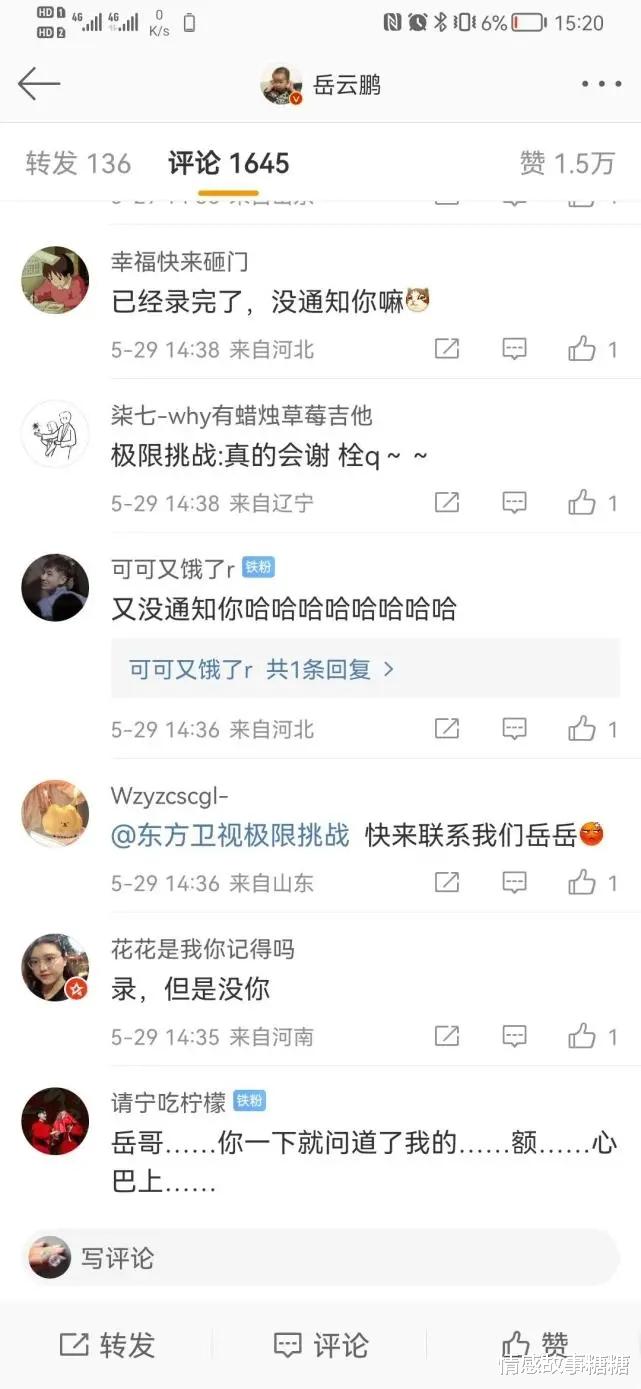 碰巧的是岳云鵬的微博剛發(fā)完,東方衛(wèi)視極限挑戰(zhàn)節(jié)目組微博立即回復道:“哥,你想我了嗎?”