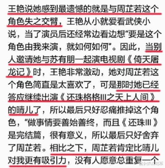 相信大家提到王艷都會想起還珠格格的晴兒吧?而王艷也確實是因為“晴兒”才放棄了“周芷若”。晴兒這個角色已經在還珠2中飾演到了極致,還珠3反而不是很出彩。“周芷若”不管是人設還是戲份都是碾壓“晴兒”的,但是無奈已經答應了,就不能反悔了。