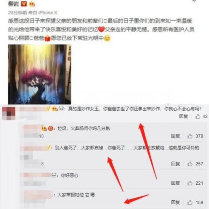 不僅父母的開銷和房子是柳巖負責,哥哥孩子的學費也是柳巖在負擔。但在有些人眼里,走性感路線就是罪大惡極,以至于柳巖在父親去世后,發文悼念,評論里都在罵她作秀,更有甚者,在悼念文下評論“笑出聲”。
