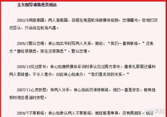 2003年,在《男才女貌》發布會之后,《壹周刊》拍攝到林心如挽唐季禮的臂彎,雙雙進入酒店……
