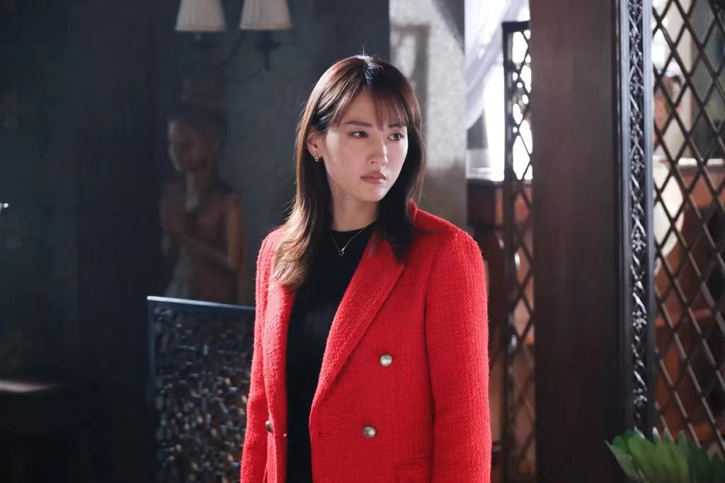 一身紅色西裝,在昏暗的別墅中極其耀眼。