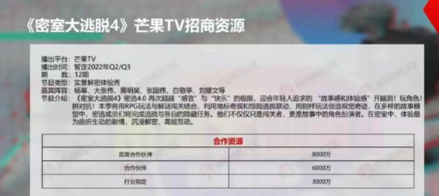 鄧倫因被爆出偷逃稅務一事而遭封殺,不僅被迫從常駐節目《密室大逃脫》“下車”,還導致第4季節目被逼迫延遲開錄,隨后有消息指白敬亭和劉耀文將加盟成為“蜜桃家族”一員。近日,《密室大逃脫4》的招商資料在網上曝光!