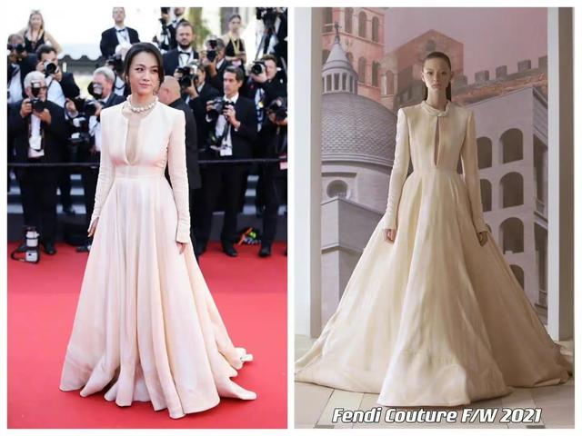 她身著FENDI2021秋冬高級(jí)定制系列禮服,香檳色禮服清新典雅,因?yàn)槟_步受傷,她沒(méi)有穿高跟鞋,但穿平底鞋的她,也撐起了這套長(zhǎng)裙,這要多虧她的身高優(yōu)勢(shì)。