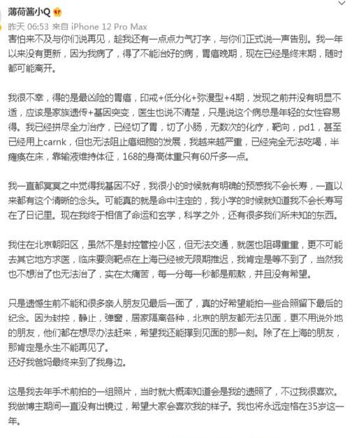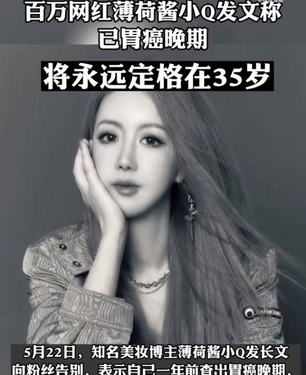 5月22日,擁有百萬粉絲的美妝網紅“薄荷醬小Q”在微博,發長文自曝最近一年多沒更新是因為自己得了治不好的病:胃癌晚期,趁自己還有一點力氣,和大家說一聲告別。