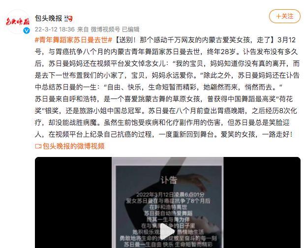 在3月12日,蘇日曼因病情惡化離開了人世,享年28歲,訃告發出后,不少網友紛紛留言悼念,蘇日曼的媽媽隨后心疼發文: