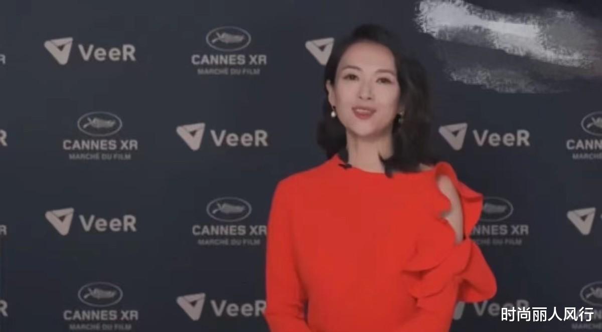 所以我們看一下章子怡的這身穿搭,雖然裙裝沒有選擇低領的款式,但是一邊肩部的荷葉邊造型搭配露膚的設計,就很好的強調了我們剛才所說的這一點。