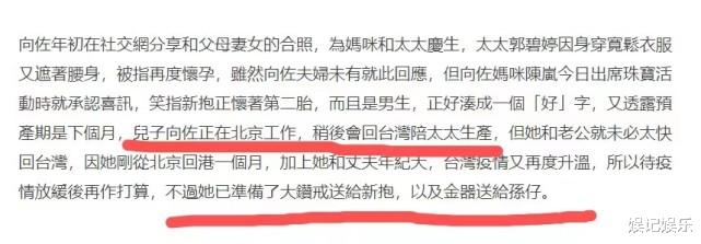 雖然郭碧婷回臺北養胎,但是老公向佐依舊在北京工作,不過向佐即將返臺陪老婆待產,因為郭碧婷的預產期就在下個月,但是向太夫婦不會馬上去臺北陪兒媳,因為老兩口年紀大了,回香港也就一個月時間,會看情況再做打算,向太雖然不會馬上去臺北,但是已經給未出生的孫兒備好禮物,郭碧婷二胎懷的是男孩,跟女兒cora剛好湊成“好”字,真好,郭碧婷向佐就要兒女雙全啦。
