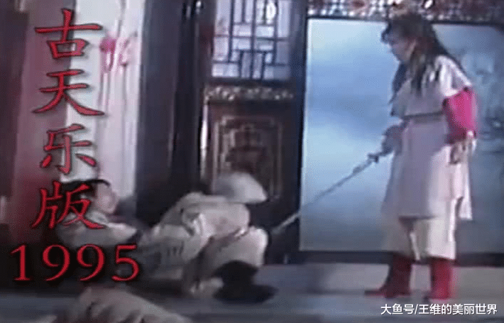 就是這個95版的了,其實這個版本的郭芙也是小編覺得最有靈氣的了。就是揮劍相向,但是呢,就看見了一個手的道具,后面的這個痛苦,都需要演技來配合。