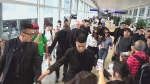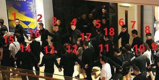 在出席某活動時,保安多到可以將他團(tuán)團(tuán)圍住,手拉手組成人墻戒備,排場夸張嚇人,在僅有的五六個圍觀的粉絲中,將他很好地保護(hù)了起來。