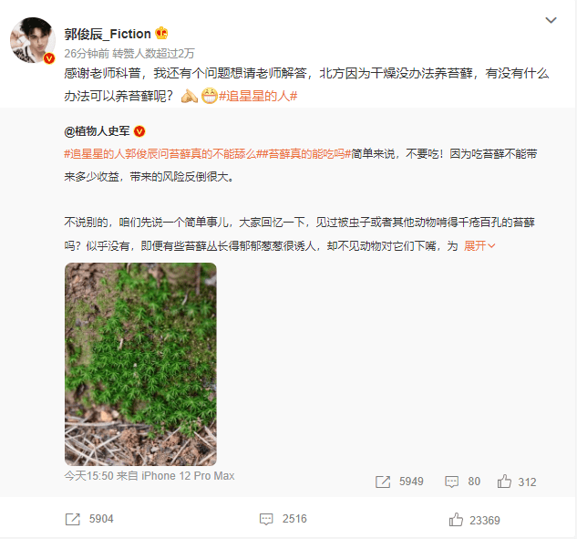 有專業(yè)的植物學(xué)家也注意到了,科普后,郭俊辰還提了新的問題,這對苔蘚的熱愛可以說是寫在臉上了!