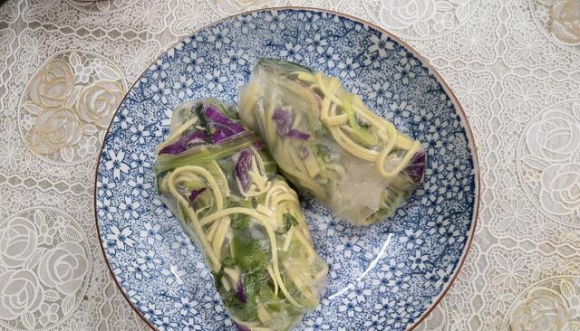 這個應(yīng)該是面皮裹了的各種蔬菜,有紫甘藍、千張絲、青菜絲,不知道里面會不會有肉呢?我想里面估計都是蔬菜,低脂低卡低熱量。有沒有粉絲朋友知道這透明面皮叫什么啊?