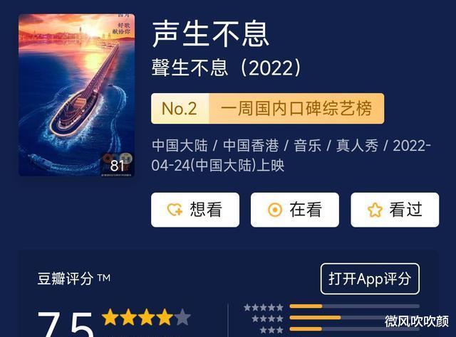 最近,《聲生不息》的豆瓣評分也出爐了,11252人打出了7.5分,這是一個相當不錯的分數,因為能上8分的音樂綜藝節目少之又少,開局拿到7.5分屬實不易。