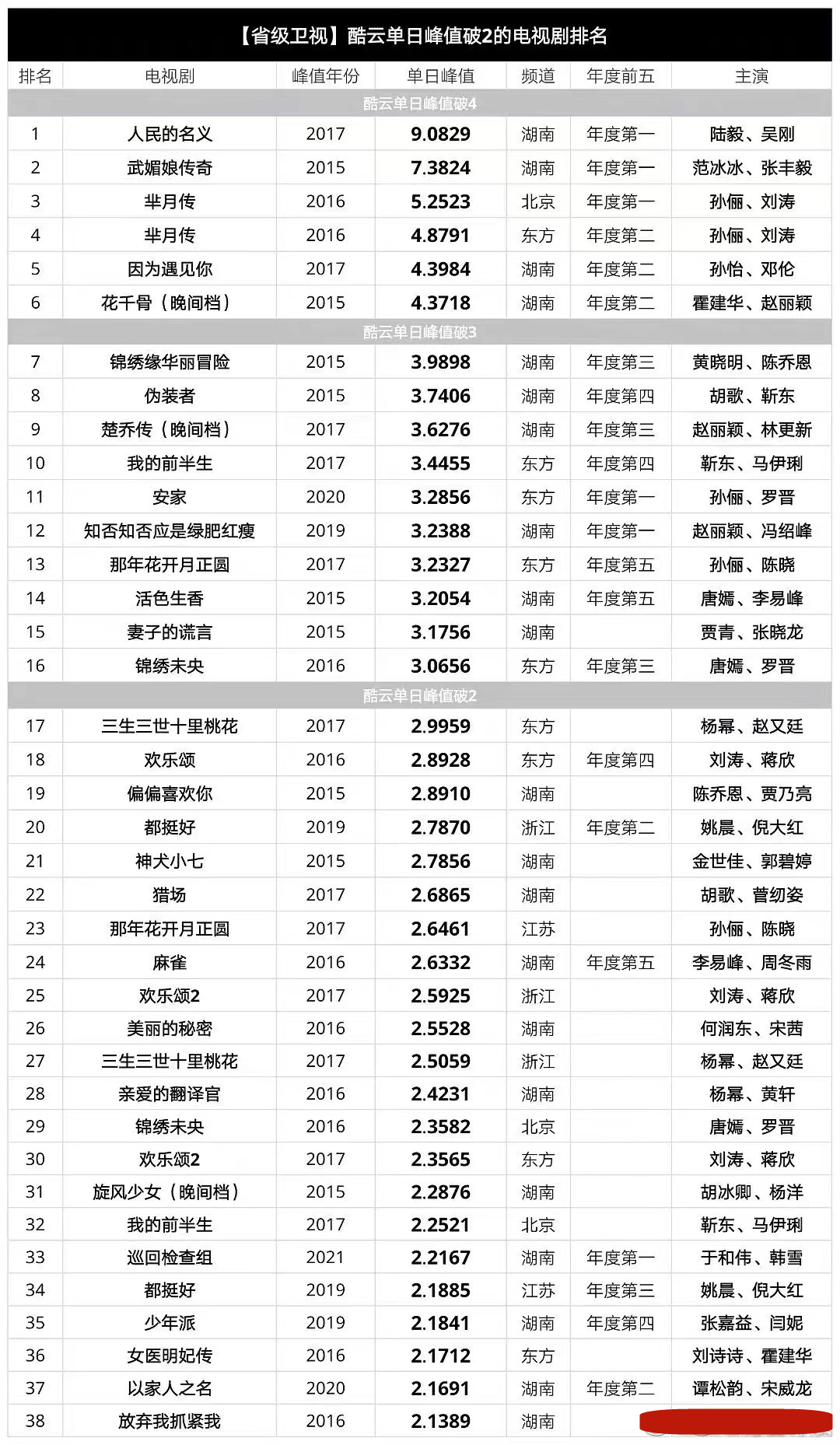 看點:近日,有網友統計出了“省級衛視酷云單日峰值破2%的電視劇排名”,一共有38部電視劇上榜。其中,湖南衛視一共有21部電視劇上榜,超過了一半,不愧是省級衛視第一名。
