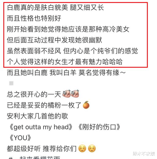 她對白鹿的評價也很高,除了贊其膚白貌美,腿又細又長之外,還對白鹿的性格稱道不已,稱其:“雖然表面弱不禁風,但內心是個純爺們,這樣的女生才最有魅力”。