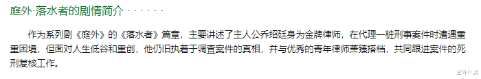 由最高人民法院影視中心聯合貓眼娛樂、優酷出品的劇,分為《庭外·盲區》和《庭外·落水者》兩部。《庭外·落水者》是主系列劇。主要講述了主人公喬紹廷、在代理一樁刑事案件時遭遇重重困境,面對人生低谷和重創,他仍舊執著于調査案件的真相的故事。