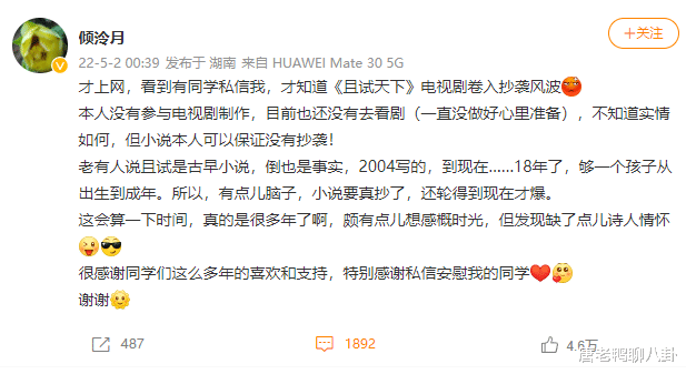 對(duì)于網(wǎng)絡(luò)上對(duì)于抄襲的爭(zhēng)吵,也逼得《且試天下》的原著小說(shuō)發(fā)文解釋。大概的意思就是電視劇我沒(méi)有參與改編,小說(shuō)肯定是沒(méi)抄襲,但電視劇抄襲沒(méi)有我不清楚。言外之意不言而喻。
