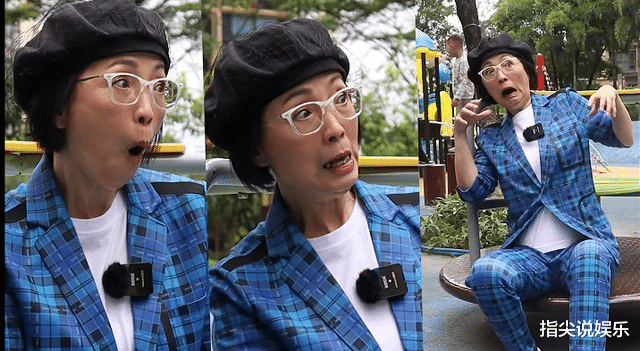 視頻中石榴姐一身藍色格子外套,搭配白色里衣,戴著一副白色框的眼鏡,頭上還戴了一頂黑色的南瓜帽,整個人看上去時尚又精神,完全看不出已經58歲。