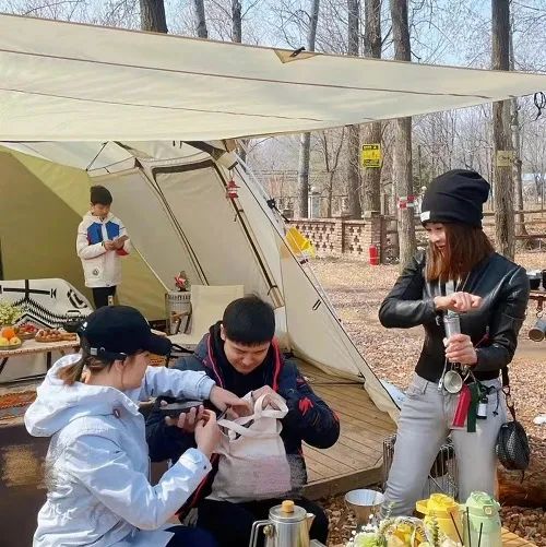 勞動完畢,一家人與好友圍坐在帳篷外的餐桌上吃喝聊天。