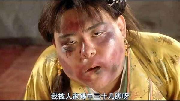 同樣的情況還出現在影片后期,在奪命書生進入華府打敗華夫人以后,擔心華夫人有危險,秋香四位丫鬟連忙撲到桌子下面,結果被反派的“面目全非腳”踢中,這時唐伯虎姍姍來遲,原本鏡頭里四位丫鬟的劇本都應該是化妝扮丑,后來鞏俐堅持不化丑妝,劇組只能緊急找了個胖群演過來接戲,直到唐伯虎再施展“還我漂漂拳”后,鞏俐才再次參演