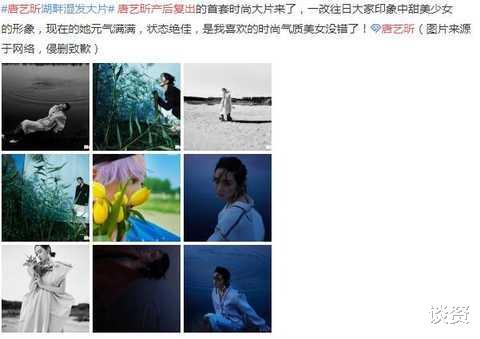 唐藝昕產(chǎn)后復(fù)出的正式亮相,是今年9月,網(wǎng)絡(luò)上曝光的一組她在湖畔拍攝的時(shí)尚大片。這也是唐藝昕產(chǎn)后第一次公開(kāi)亮相。