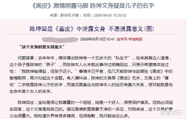 各種暗戳戳的蛛絲馬跡也讓人心生疑云,在電影《畫皮》流出的一張戲劇照中,陳坤的胳膊上就很顯眼地紋了“尊佑”二字,有人猜測正是陳坤兒子的大名,但是當時身邊人都替他辟謠了。后來事實還是證明,群眾的眼光是雪亮的。