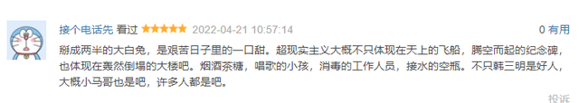 “掰成兩半的大白兔,是艱苦日子里的一口甜。超現(xiàn)實(shí)主義大概不只體現(xiàn)在天上的飛船,騰空而起的紀(jì)念碑,也體現(xiàn)在轟然倒塌的大樓吧。煙酒茶糖,唱歌的小孩,消毒的工作人員,接水的空瓶。不只韓三明是好人,大概小馬哥也是吧,許多人都是吧。”