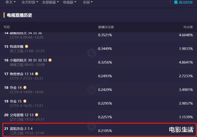 這部以特型消防員為主角的《藍(lán)焰突擊》,以消防救援為主題的影視劇本來(lái)熱度就高,再加上有男神任嘉倫的加持,讓這部劇在開播之前就備受期待,沒想到播出之后口碑竟然跳崖式下跌,就連收視率也降到了0.2,在眾多同時(shí)段播出的劇集中位列21名。