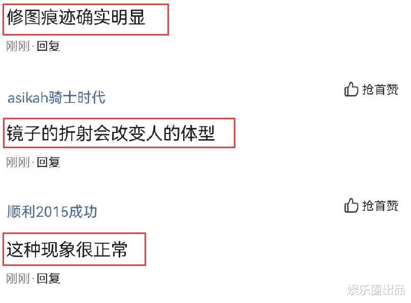 不過,網(wǎng)友們對(duì)這種說法有著不同的看法,不僅有網(wǎng)友認(rèn)為這是正常現(xiàn)象,而且還有網(wǎng)友認(rèn)為鏡子的折射會(huì)改變?nèi)说捏w型,不過,也有一位網(wǎng)友表示“修圖痕跡確實(shí)明顯”。