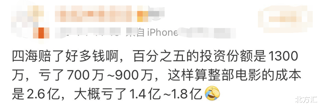 這陣子,電影《四海》的一家投資商給出了關于電影虧損的提示性公告,這家投資商稱當初購買了《四海》5%的投資份額,結果預計虧損700萬—900萬元;而《四海》整部電影的成本是2.6億,按照這個賠損率計算下來,這片子大概虧了1.4億—1.8億……嘖嘖嘖,賠進去了約莫一大半的錢,《四海》可以說是這兩年電影圈子里絕對的恥辱沒有之一了!