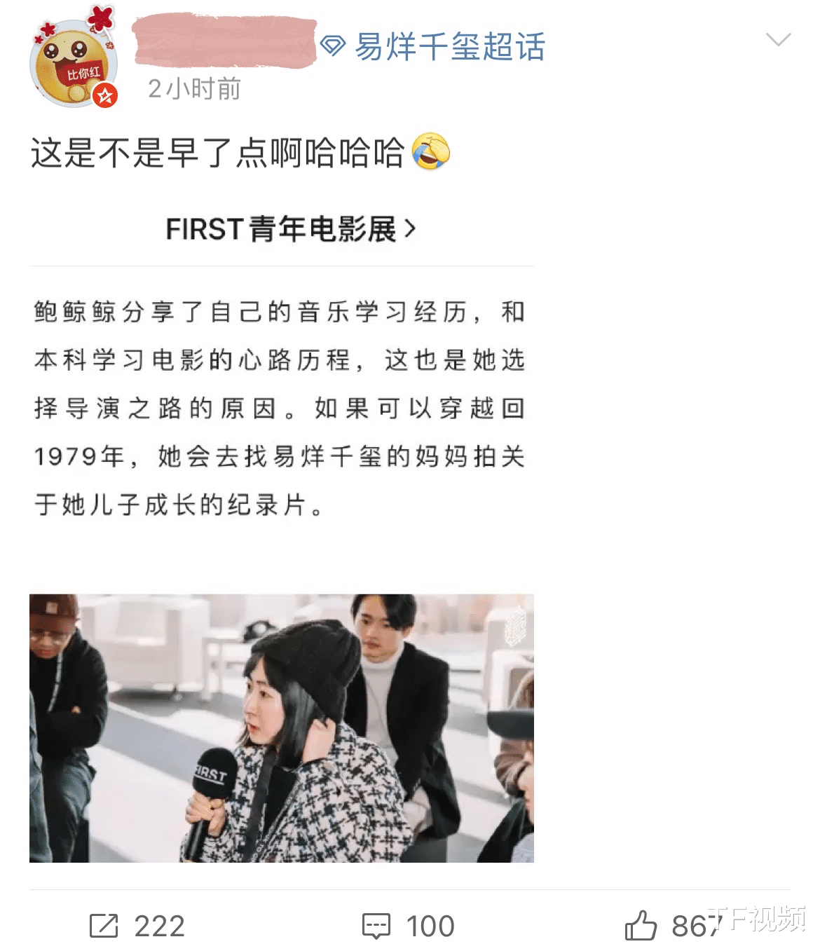 近日就有千璽粉絲翻到了一個有關電影展的分享會,雖然這個青年電影展的交流會并沒有千璽的參與,但是有一位青年電影人在和大家交流的時候,提到了千璽。但是這位電影人提到千璽的原因,并不是對千璽的作品或者演技進行評價,而是一個與千璽媽媽有關的奇思妙想。